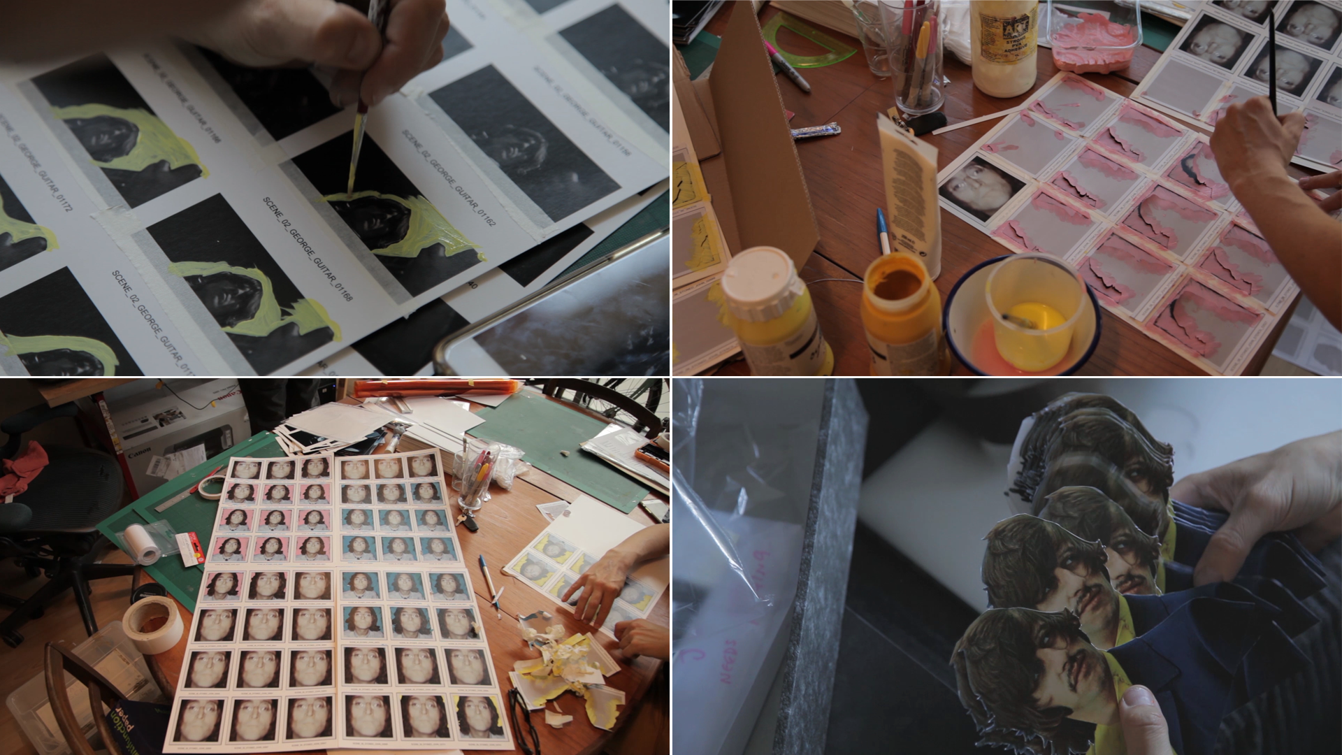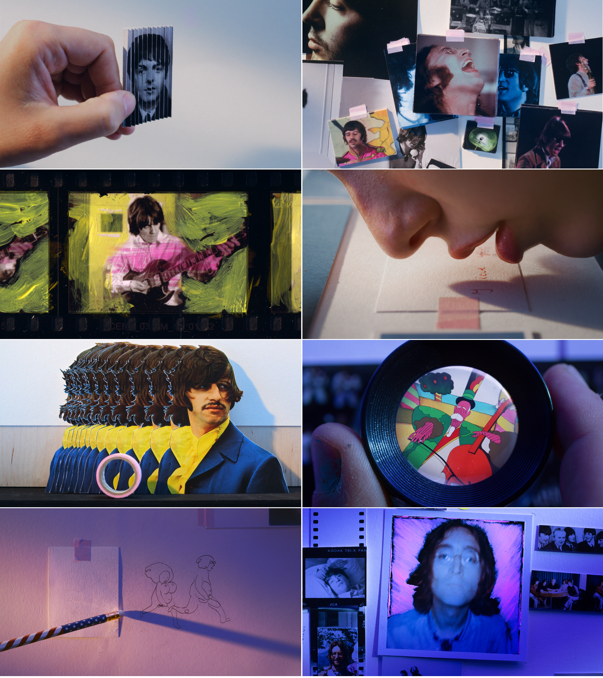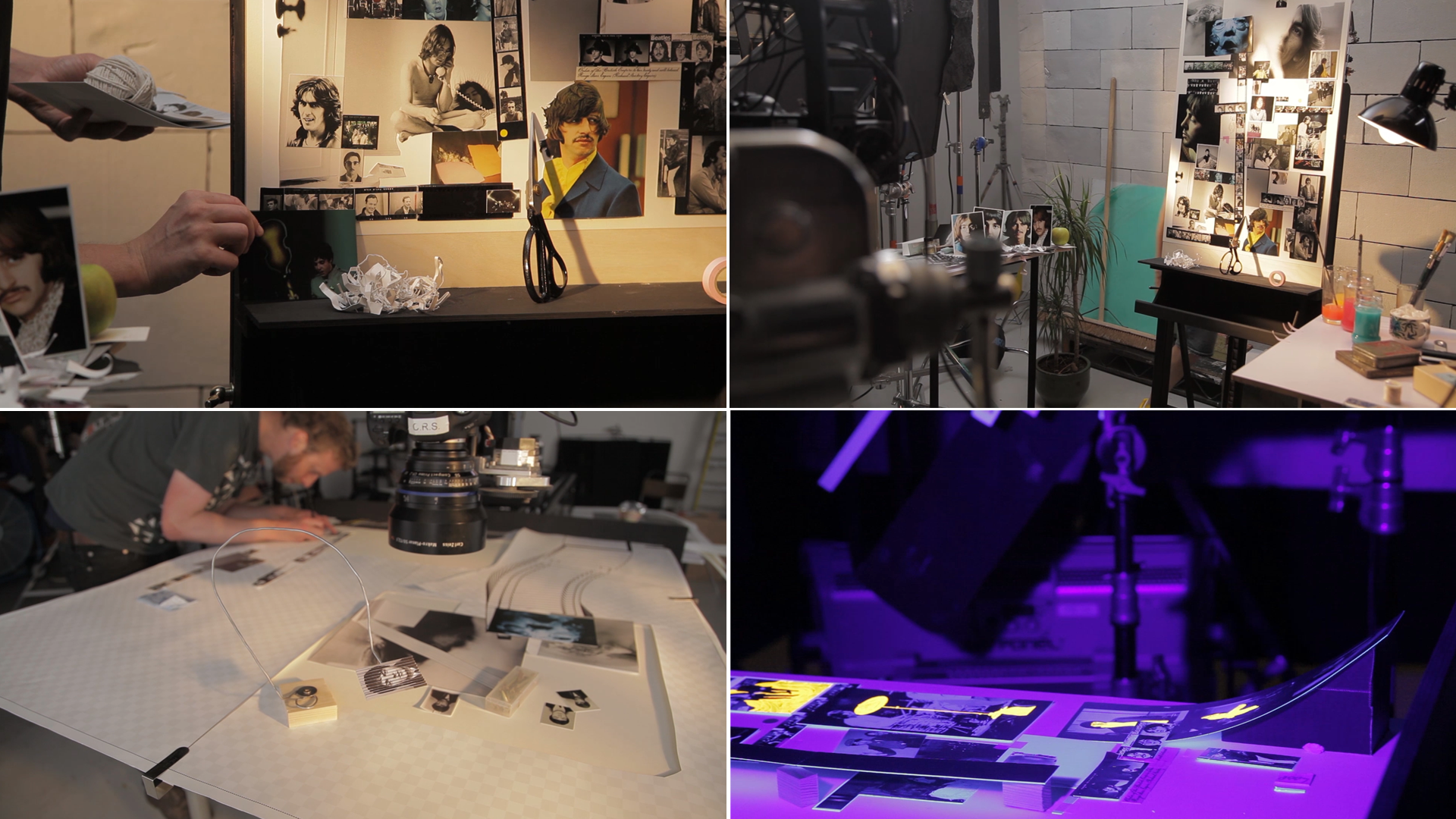 The team used a plethora of techniques to bring the piece alive, including stop motion, live action, hand drawn 2D on paper, 3D modelling, scratch film, rostrum cut out replacements, pixilation and hand painted artworking. With Jock Mooney’s artistic eye heading up the artworking, and Layla Atkinson heading up the printing, the pre-production on the project was intense. In order to achieve the final look, thousands of photographs from archive sources were edited, printed out, numbered, and either painted on, scratched, or generally man handled, before being shot under a motion control camera. As the video contained so many different techniques there was never a dull moment, from building sets that represented Richard Hamilton’s studio to carefully cutting out thousands of photos including some particularly scissor tricky images of Ringo Starr, who at the time sported a fabulously shaggy hairstyle. On most projects you have perhaps two or three challenging shots, but with there being so many hand crafted techniques, and by pushing the motion control rig to the limit, nothing was easy. The shooting of this project was a battle between creative desire and technical limitations. However, with such an amazing camera team, headed by DOP Pete Ellmore, although there were some late nights, the team captured everything they needed and more. Stitching all the shot footage together was always going to be a reasonable battle, but with such beautiful source imagery, and with expert planning and the masterful hand of Alasdair Brotherston in the compositing seat, it all came together seamlessly.